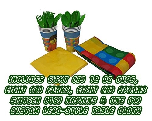 -. Feature : FULL PARTY KIT: This party set has all the party supplies you need to serve and even entertain eight guests at a L.E.G.O-theme birthday party or just for fun. Invite friends and family from all over to come celebrate your child's love of L.E.G.Os! / PREMIUM QUALITY SUPPLIES: We've crafted our cups, plates and utensils to be far superior to other brands. In fact, our plates and cups are thicker and stronger to help prevent spills, the utensils are a matte-finish, and the plastic tablecloth is thicker to protect your table or counter. To top things off, we made sure our balloons were nice and big (12-inch) - these are the big fun balloons you remember from your childhood. / 100% SATISFACTION GUARANTEE: If for any reason you're not happy with your purchase, please don't hesitate to get in touch so we can issue you a full refund. Our goal is your complete satisfaction with our products. Anything less just doesn't cut it. / BONUS: With each set, we've included 8 random L.E.G.O-compatible Race Car sets with mini figure drivers to assemble and race! They come disassembled so you can even make a race of who can assemble their car and character the fastest. Then when you're done, everyone gets to take home their creation as a fun P.R.Ize! Since there are 6 possible cars, so please expect some duplicates since each pack includes 8 race cars. / DO GOOD WHILE YOU PARTY: 5% of this product's profit is donated to very efficient non-profits that help to bring critically-needed medicine to sick kids, and also helps to reunite children with their parents after disasters both in the U.S. and abroad.