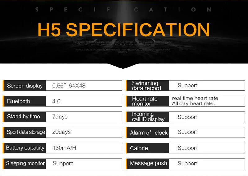 - Function:Passometer,Fitness Tracker,Sleep Tracker,Message Reminder,Call Reminder,Push Message
