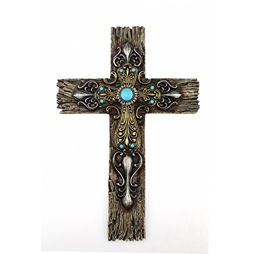 Comfy Hour 12" Wood Wall Hung Blue Diamond Classic Cross, Stone Resin Sculpture, Christmas Gift, Multi Color