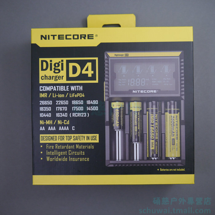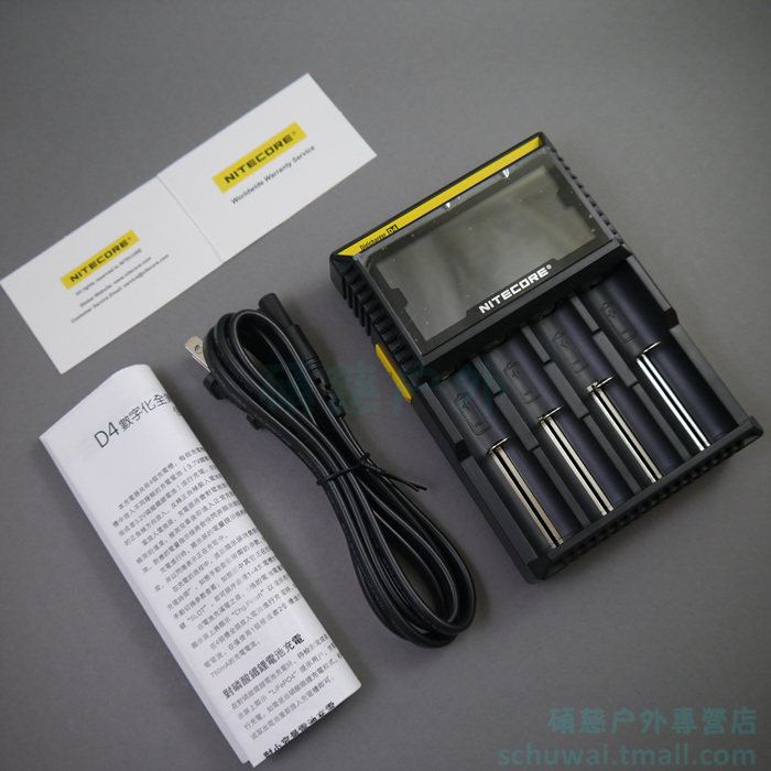 简述 这是一个全能的充电器,它兼容市面上几乎所有型号的充电电池,让您不需要为各种各样的充电电池寻找合适的充电器而苦恼。D4充电器可自动识别锂充电电池及镍氢(Ni-MH)镍镉(Ni-Cd)电池和手动选择磷酸铁锂电池,并自动选择充电模式(恒流,恒压,dV/dt)对其充电。每个D4充电器具有4个由微电脑独立控制的充电槽,用户可在每个槽里放入任意型号的电池进行充电。内建数码液晶显示屏,实时显示电池的各项充电参数和充电进程,在电池充满后充电器将自动停止充电。可以说D4是一个独特全自动的数码液晶智能充电器,您只需要放入电池,其他的事情,放心交给它完成吧! 产品特性 ·可同时对4节电池进行充电 ·4个充电槽独立控制,互不影响 镍镉充电电池26650, 22650, 18650, 17670, 18490, 17500, 18350, 16340( RCR123 ), 14500, 10440AA, AAA, AAAA, C ·对IMR电池充电进行优化设计 ·内建高清LCD显示屏,可以实时显示电池的各项充电参数及充电进程 ·设有两个侧按键可手动切换显示的充电槽和切换各项充电参数 ·智能系统根据检测电池类型及状态进行自动选择充电模式(恒流,恒压,dV/dt) ·自动检测电池电量状态,并自动选择适合的电压及充电模式(除磷酸铁锂电池) ·兼容磷酸铁锂电池 ·兼容小容量电池 ·电池充满后自动停止充电 ·设有对电池充电超时保护功能 ·内置温控保护功能 ·采用ABS防火阻燃材料制造 ·电池防反接保护功能 ·优良散热设计 ·通过RoHS、CE、FCC及CEC等多项安全质量认证 ·本产品受中国平安保险(集团)股份有限公司全球承保 ? 参数 输入: AC 100-240V 50/60Hz 0.35A(MAX) DC 12V 1A 输出电压: 4.2V ±1% / 3.7V ±1% / 1.48V ±1% 输出电流: 375mA x 4 / 750mA x 2 兼容电池: Li-ion / IMR / LiFePO4: 26650, 22650, 18650, 17670, 18490, 1750 0, 18350, 16340( RCR123 ), 14500, 10440 Ni-MH(Ni-Cd): AA, AAA, AAAA, C 尺寸: 143mm× 99mm×36mm(长/宽/高) 重量: 239g(不含电池、电源线) ? 使用说明 将电源线(或车用适配器)一端插入D4充电器,另一端插入电源插座,充电器将亮起液晶显示屏及所有电量显示条进行自检,自检结束后,充电器将显示型号及四个空白电量显示条并进入待机状态。若在1分钟内充电器各充电槽均没放入电池,充电器将进入节能模式(关闭屏幕显示与背光);当放入电池或按下任意按键即激活显示屏。 注意事项 1. 由于本充电器设计为兼容多种电池,所以对某些电池(26650,AAA等)进行充电时,可能需要人手稍微调整电池位置使电池与充电器两极接触好才可进行充电。 2. 本充电器仅限于对锂离子、IMR、磷酸铁锂或镍氢/镍镉充电电池进行充电,若对其它类型的电池进行充电可能会导致爆炸、电池破裂或漏液、人身伤害或财产损坏。 3. 本充电器专用于室内及车内充电,请勿将其暴露于雨中或雪中。 4. 请勿分解或组装充电器。 5. 儿童必须在成人的监督下使用本充电器。 6. 请在0℃--40℃温度范围内使用本充电器。 7. 请勿在火源、直射阳光下、发热的设备旁或其它高温场所使用或储存本充电器。 本充电器共有4个充电槽,每个充电槽均可独立控制,用户可在各个充电槽中放入不同种类的充电电池(3.7V锂离子充电电池、1.2V镍氢/镍镉充电电池或者3.2V磷酸铁锂电池)进行充电。在放入电池时,应按照充电器上所标识的正负极方向放入,反转正负极装入电池将不能进行充电。 当放入电池后,充电器将会对电池进行检测,对应的电量指示条将会显示检测的进度,检测完毕后即进入正常充电状态。如果检测到异常,如反装电池,对应的电量指示条将会快闪并显示错误(Err)提示用户并停止充电。充电进行时,显示屏的电量提示条将显示电池的电量状态及目前充电的进度,并以闪烁表示正在充电中。 在充电的过程中,液晶显示屏将会顺序显示“电池电压”-“电流”-“已充电时间”,如想手动查看所需的参数,只需按一下侧按键“MODE”,即可手动切换参数查看;如想选中其它正在充电的电池查看参数,只需按一下侧按键“SLOT”,即可顺序选择1-4充电槽的电池。 在电池充满电之后,5格的电池电量显示条将全部亮起并停止闪烁,同时显示屏上显示“Chg.Finish”以提示用户充电完成。 在4个槽全部放入电池进行充电时,本充电器将输出每槽大375mA的充电电流。在仅使用1个槽或者2个槽进行充电时,本充电器将输出每槽大750mA的充电电流。 对磷酸铁锂电池充电 在对磷酸铁锂电池充电时,待检测完成后,长按侧按键“MODE”超过2秒,显示屏上显示“LiFePO4”提示用户,充电器即进入磷酸铁锂充电模式对电池进行充电。如需退出磷酸铁锂充电模式,只需再次长按侧按键“MODE”超过2秒或取出电池重新放入充电槽即可。 对小容量电池充电 提示:在对容量少于750mAh的电池(如AAA、10440和16340等小容量电池)进行充电时,建议使用低电流充电模式以提升小容量电池的使用寿命。 选择低电流充电模式: 在正常的充电状态下,通过侧按键“SLOT”选择相应的电池,然后长按侧按键“MODE”超过1秒,这时显示器上显示“LOW”时即进入低电流充电模式。如需退出低电流充电模式,只需再次长按侧按键“MODE”超过1秒或取出电池重新放入充电槽即可。 夜间充电模式 充电器在夜间对电池进行充电时,可以采用夜间充电模式。在任何状态下长按侧按键“SLOT”超过1秒,显示屏背光熄灭即进入夜间充电模式,使你不受到显示屏的背光灯打扰。若想再次激活显示屏的背光,只需再次长按侧按键“SLOT”超过1秒