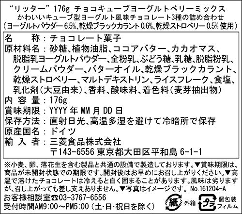 原材料:砂糖、植物油脂、ココアバター、カカオマス、脱脂乳ヨーグルトパウダー、全粉乳、ぶどう糖、乳糖、脱脂粉乳、クリームパウダー、バターオイル、乾燥ブラックカラント、乾燥ストロベリー、マルトデキストリン、ライスフレーク、食塩、乳化剤(大豆由来)、香料、酸味料、着色料(麦芽抽出物)