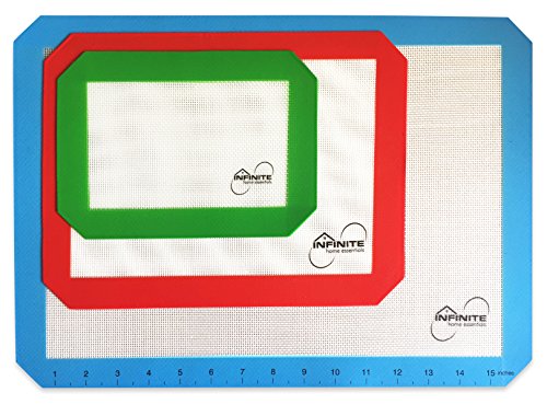 VALUE 3 PACK- Infinite Home Essentials-Silicone Baking Mats- replace Cookie Sheets and Parchment Paper. GO GREEN and SAVE MONEY with our reusable silicone mats. Turn any pan into a non-stick surface. Our colorful multipack gives you countless options. Use the half-sheet mats to line standard baking trays. Use the 1/4-sheet liner on baking tray in your toaster oven, for small batches and much more and use the small mat for meatloaf, breadpans or kids cooking.