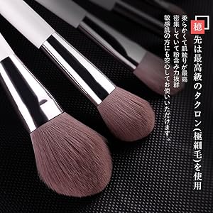 穂先は最高級のタクロン(極細毛)を使用。たっぷりとした用量なのでふわふわ感満点プロの技で、あのいやな「ちくちく」を徹底解消!敏感肌の方やお肌の弱い方にも安心してお使いいただけます。