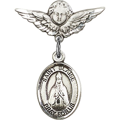 -. Title : Sterling Silver Baby Badge with St. Blaise Charm and Angel w/Wings Badge Pin 7/8 X 3/4 inches