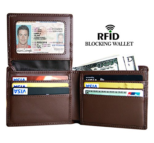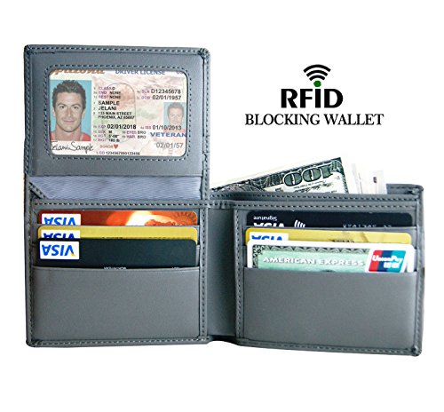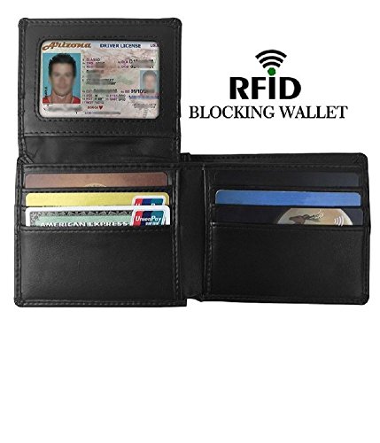 -. Feature : Measures 4 1/3 x 3 1/2 x 1/2 inches; 4.8 ounces / Only the best quality product is delivered to our customers. Features a unique military grade shielding technology & proprietary blocking material. Protect your RFID Credit Cards, Debit Cards, ID Cards from electronic thief / This is a simple, clean, traditional bifold design wallet Includes nine card slots, one bill pocket with Full size Bill section, and ID window (ID window is attached), made with high quality durable leather to meet your daily needs. / Designed to Be Compact won't weaken or fray, for a man's wallet that will last for years! This wallet's slim profile fits nicely in your front or back pocket reducing back strain. / Great for gift. Enjoy your life and Just put a bow on it and you're ready to give to your special someone with RFID Blocking Men's Leather Wallets Card Case