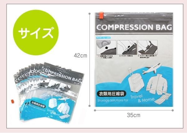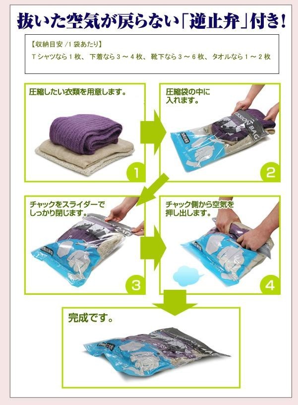 旅行や衣類の整頓にお得な10枚セット。押すだけで簡単に圧縮できます。抜いた空気が戻らない「逆止弁」付きです。 |
