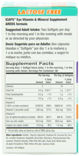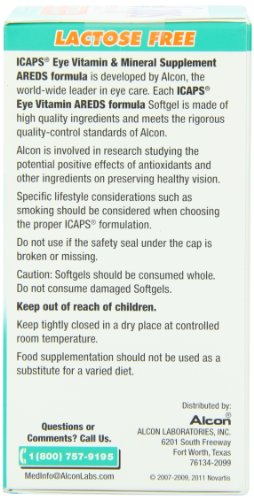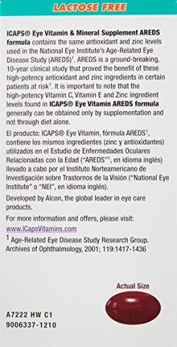 -. Binding : Health and Beauty -. Brand : ICaps -. EAN : 0300658046031 -. Feature : Helps preserve healthy vision / Just 2 Softgels per day / Lactose free -. IsAdultProduct : 0 -. Label : ICaps -. LegalDisclaimer : IN NO EVENT, REGARDLESS OF CAUSE, SHALL ALL STAR SALES BE LIABLE FOR ANY INDIRECT, SPECIAL, INCIDENTAL, PUNITIVE OR CONSEQUENTIAL DAMAGES OF ANY KIND, WHETHER ARISING UNDER BREACH OF CONTRACT, TORT (INCLUDING NEGLIGENCE), STRICT LIABILITY OR OTHERWISE, AND WHETHER BASED ON THIS AGREEMENT OR OTHERWISE, EVEN IF ADVISED OF THE POSSIBILITY OF SUCH DAMAGES. -. Manufacturer : ICaps -. Model : ALCON453415 -. MPN : 300658046031 -. NumberOfItems : 1 -. PackageQuantity : 1 -. PartNumber : 300658046031 -. ProductGroup : Health and Beauty -. ProductTypeName : HEALTH_PERSONAL_CARE -. PublicationDate : 2011-01-12 -. Publisher : ICaps -. Size : 1 -. Studio : ICaps -. Title : Icaps Areds Formula Eye Vitamin and Mineral Supplement, 120 Softgels, -. UPC : 811962235481