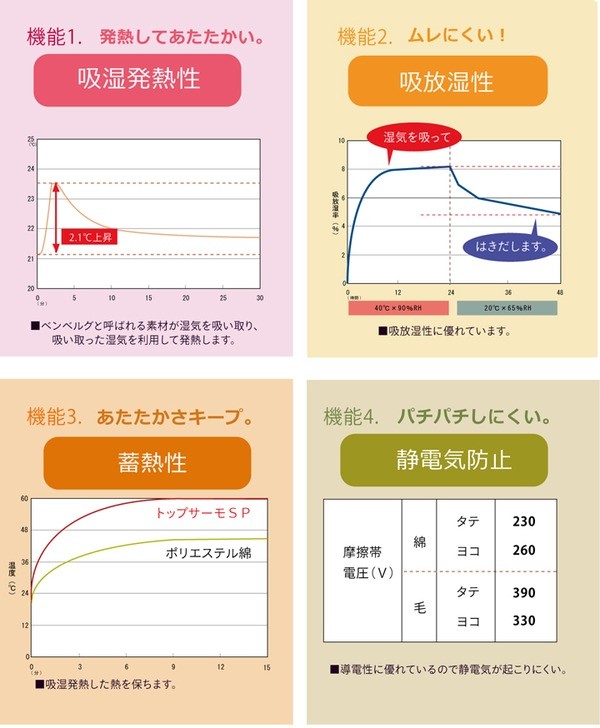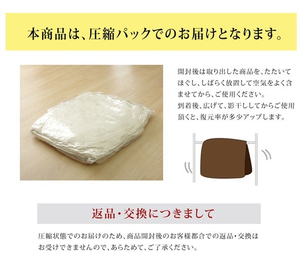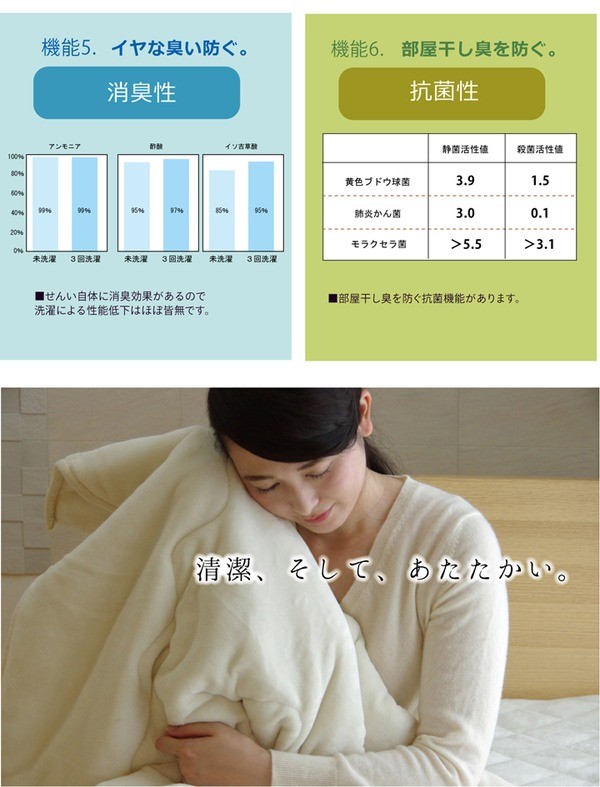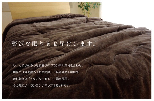 中材に旭化成の吸湿発熱、抗菌・消臭機能素材トップサーモSPを使用しています。トップサーモSPとは、ベンベルグ(キュプラ)とポリエステルを混綿した機能性中綿です。(1)吸湿発熱性、「ベンベルグ」が湿気を吸うと発熱し、糸同士の隙間に暖かい空気を蓄える構造になっています。(2)吸放出性、体が暖まったことで発生する余分な湿気は外に放出するので、暖かく蒸れにくい快適な寝心地を感じて頂けます。(3)蓄熱性、吸湿発熱した熱を保ち温かさが持続します。(4)消臭性、消臭機能を持つベンベルクDCがアンモニア・酢酸・イソ吉草酸の消臭に効果を発揮します。繊維自体に消臭機能があるので、洗濯などによる性能低下はほとんどありません。(5)抗菌性、部屋干し臭の発生を防ぐ抗菌機能があります。(6)摩擦耐電性、導電性に優れているので静電気が起こりにくい。直接肌に触れる部分にはフランネルと呼ばれる、しっとり柔らかい生地を使用しております。適度に光沢をプラスすることで高級感も演出しております。同色で同じ素材の敷パッドも別途取り扱いがありますので、トータルでのコーディネートもお勧めです。ご家庭の洗濯機で洗えます(ネット使用)ので、いつでも清潔にご使用頂けます。※本商品は圧縮梱包でのお届けとなります。商品が届きましたらお早めに開梱して頂き、2~3時間日陰干しをして頂くと復元が早まります。