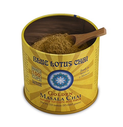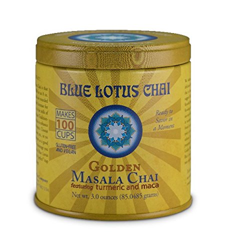 -. Binding : Misc. -. Brand : Blue Lotus Chai -. EAN : 0857730006105 -. Feature : Golden Chai is the Newest Flavor from Blue Lotus Chai! Featuring Superfoods Tumeric & Maca / No sweeteners, fillers, additives, milk powder or hydrogenated oils / Free of artificial flavors, colors, and preservatives / Great value - 100 servings per tin! With bamboo serving scoop included / Made with Organic Spices -. IsAdultProduct : 0 -. Label : Blue Lotus Chai -. Manufacturer : Blue Lotus Chai -. PackageQuantity : 1 -. ProductGroup : Grocery -. ProductTypeName : GROCERY -. Publisher : Blue Lotus Chai -. Size : 3 Ounces -. Studio : Blue Lotus Chai -. Title : Blue Lotus Golden Masala Chai - 3oz Tin (100 cups) -. UPC : 857730006105