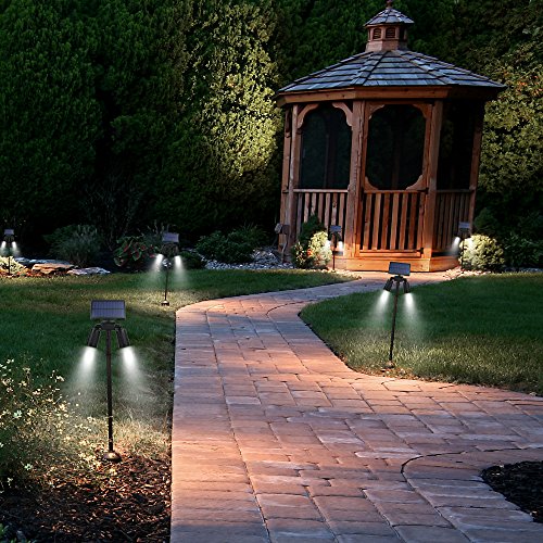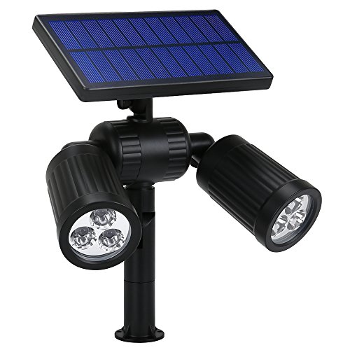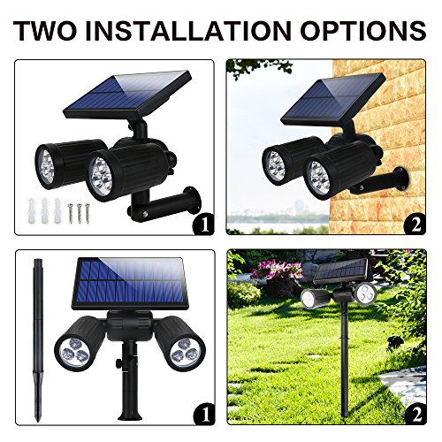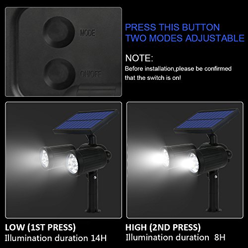 - Upgraded Solar Spotlights: With two lighting modes, 6 LED super bright bulbs, the outdoor solar light can produce 350lumens max lighting. Enhanced with IP65 waterproof and heatproof, the landscape light is a must have for your patio deck and garden.