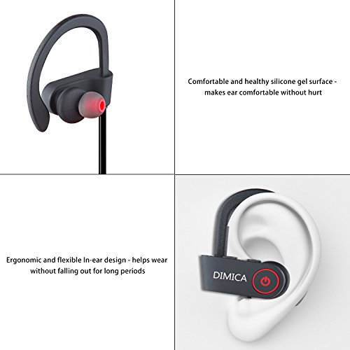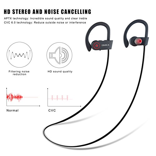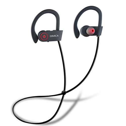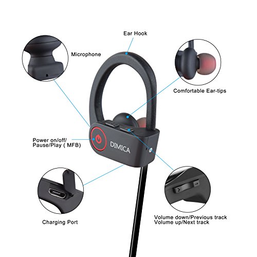 -. Title : DIMICA Bluetooth Headphones with Mic Stereo Headphones IPX7 Waterproof Sports Wireless Headset Secure Fit Noise Cancelling Headphones In-Ear Earbuds for Workout 8 Hour Battery, Black