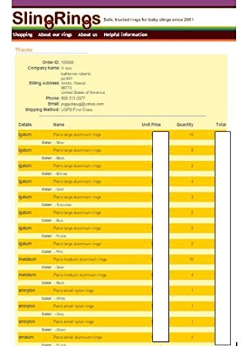 **VERY IMPORTANT!** *EACH and EVERY set comes with a SAFE BabyWearing Checklist. If this is missing from your package, you may have ordered unsafe/knockoff rings made in China and sold by an impostor. These original SlingRings are made, packaged and shipped in the USA. Both SlingRings and Lil' Eco are family businesses, with Work From Home Mom's that support Attachment Parenting and safe Babywearing. The Rings come in a wide variety of colors, in either Aluminum (Lead and Nickle Free) or Nylon (Phthalates-Free) and the 5 sizes range from super mini to Large, insuring that you always have the perfect slip-free size for your carrier. All rings are measured from the inside edge to the other inside edge. This is their inner diameter. The nylon rings are SMALL 2 1/4"(5.7 cm), MED 2 5/8" (6.7 cm), LARGE 2 7/8" (7.3 cm) and are 0.4" (1 cm) thick. The aluminum rings are SMALL 2" (5 cm) MED 2.5" (6.4 cm), LARGE 3" (7.6 cm) and 0.25" (.64 cm) thick.Feature