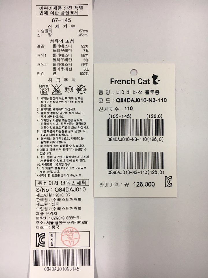 제품소재 : 겉감 폴리에스터93% 폴리우레탄7%배색1 폴리에스터95% 폴리우레탄5%배색2 폴리에스터95% 폴리우레탄5%안감 면100%