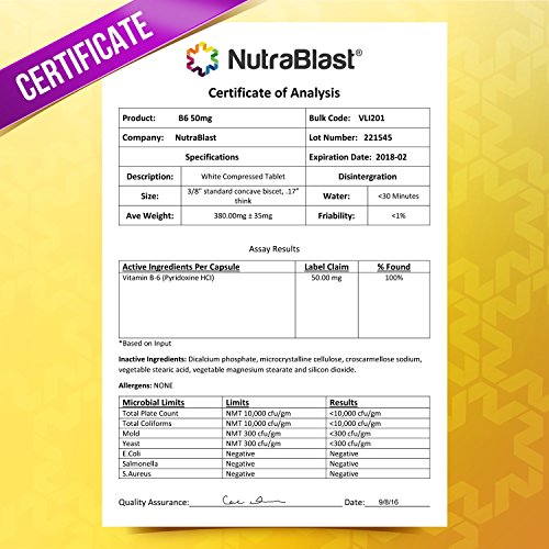 Studio : NutraBlast Publisher : NutraBlast Binding : Health and Beauty Product Description Why Is Vitamin B6 Needed? Many different types of foods naturally contain Vitamin B6, including many vegetables. Vitamin B6 is crucial for support of a healthy metabolism and brain function, meaning there are several advantages to using NutraBlast B6 50mg -100 tablets. It is also particularly supports a healthy immune system. Why Buy This Product? Many individuals require supplementary vitamins in order to get proper nutrition. Getting a sufficient amount of B vitamins supports your cardio vascular health. High Quality This product contains vitamins to support cardiovascular health. Every bottle is screened for purity and potency. This item is gluten-free and does not contain milk, wheat, yeast, salt, sugar, shellfish, corn, starch or preservatives. Other features include: Good for support of your nervous system Supports proper homocysteine levels A bottle contains 100 tablets of Vitamin B6 50mg A serving size equals one tablet Recommended to take one tablet daily with a meal Store the bottle in a cool, dry place Made in the United States of America 0