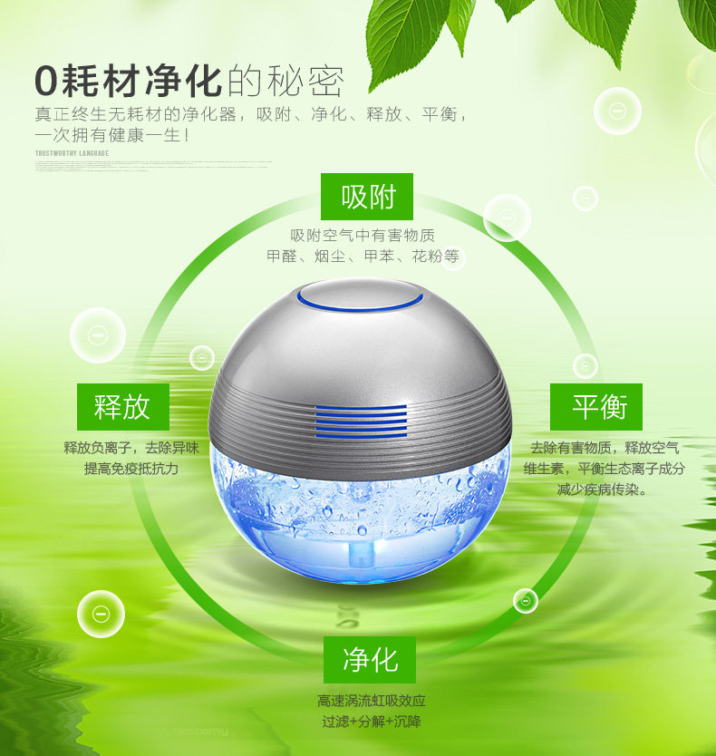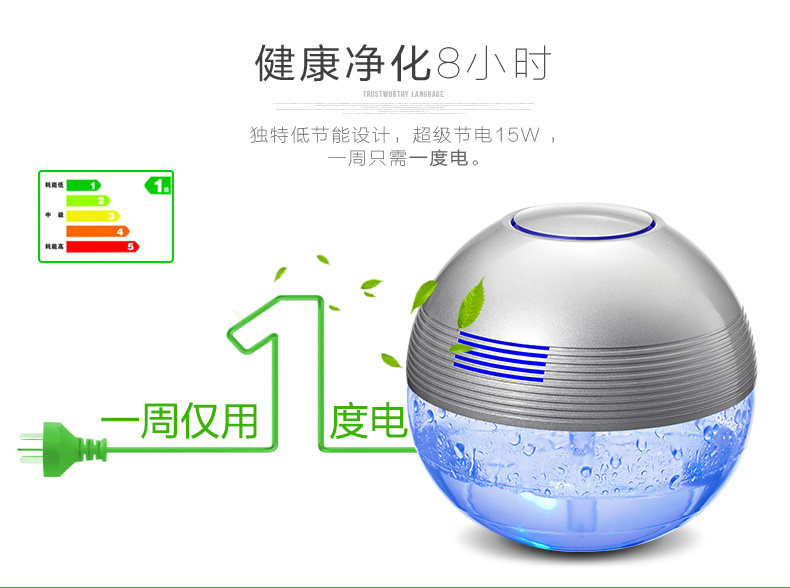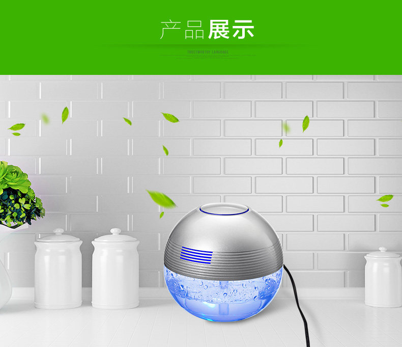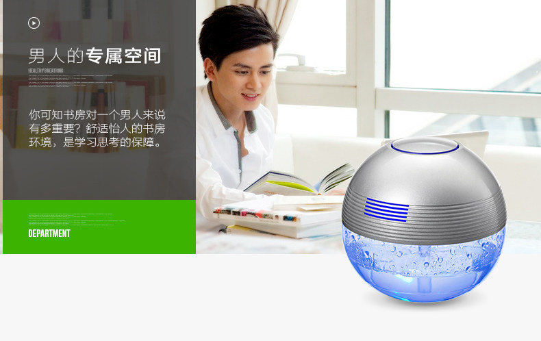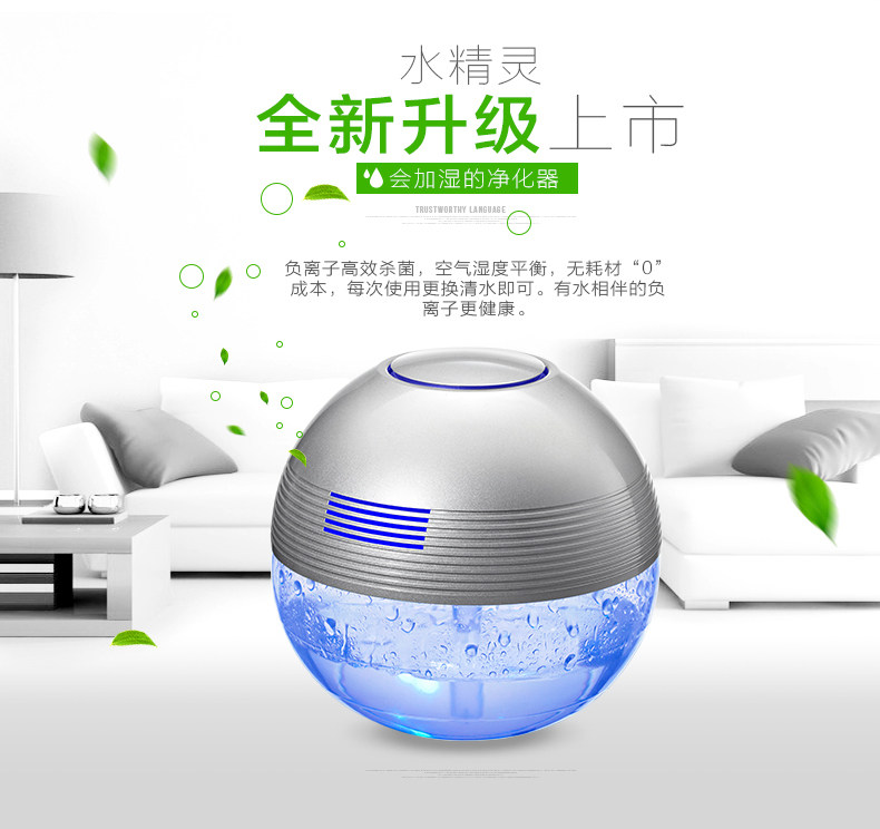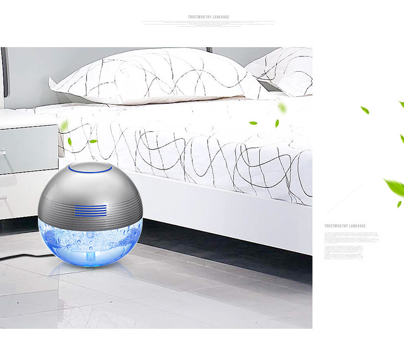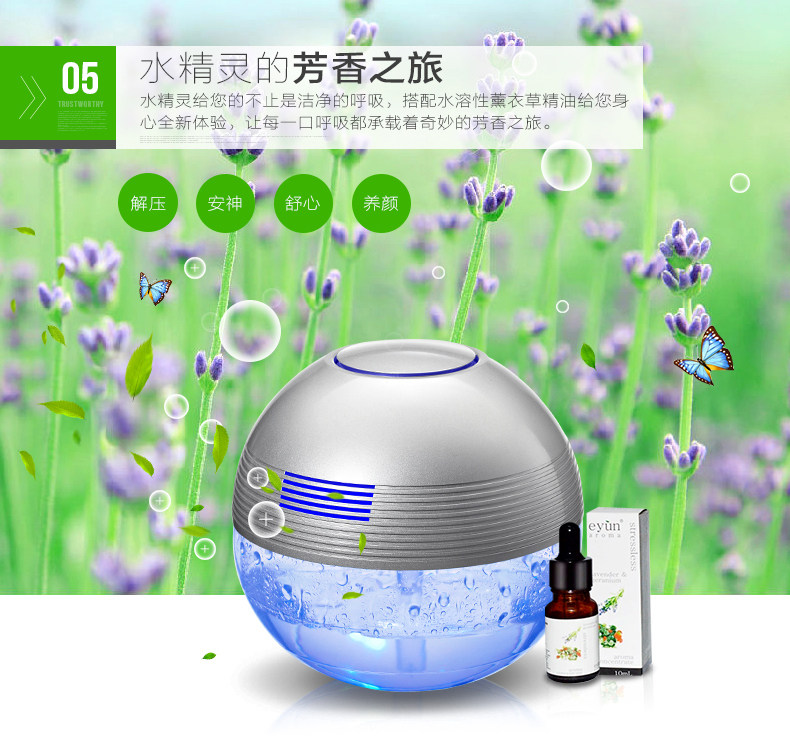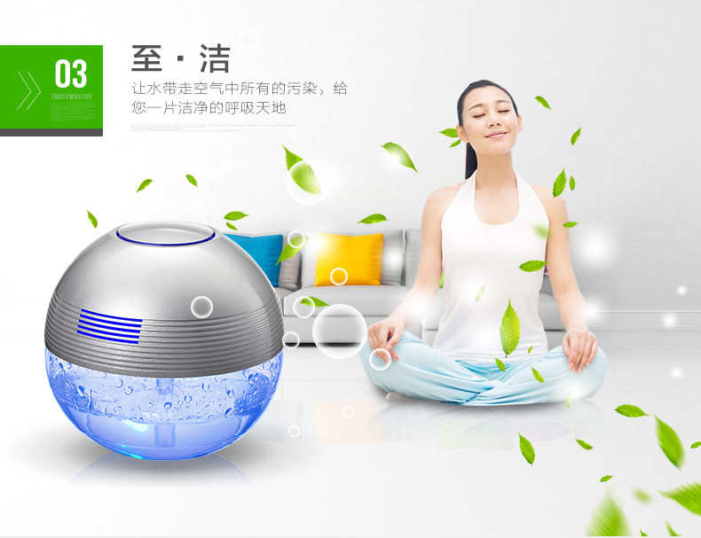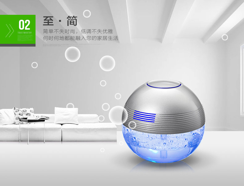The principle of turbo type structural design, the delicately designed wind wheel, can throw off the water evenly from all directions, so that the dust, bad smell and bacteria will be indrawn into water for decomposition or precipitation. Meanwhile, due to the rapid collision between water molecules and the wall of the bottle, artificial waterfall can be made so as to generate negative ions. Drip several drops of natural essential oil and perfume into the water to produce natural For aroma so as to make the purified air wet, fragrant, refreshing and clean.