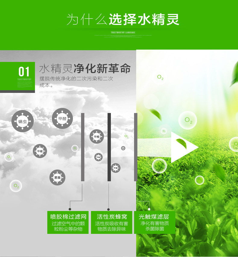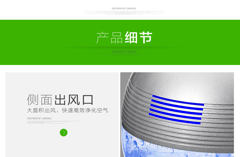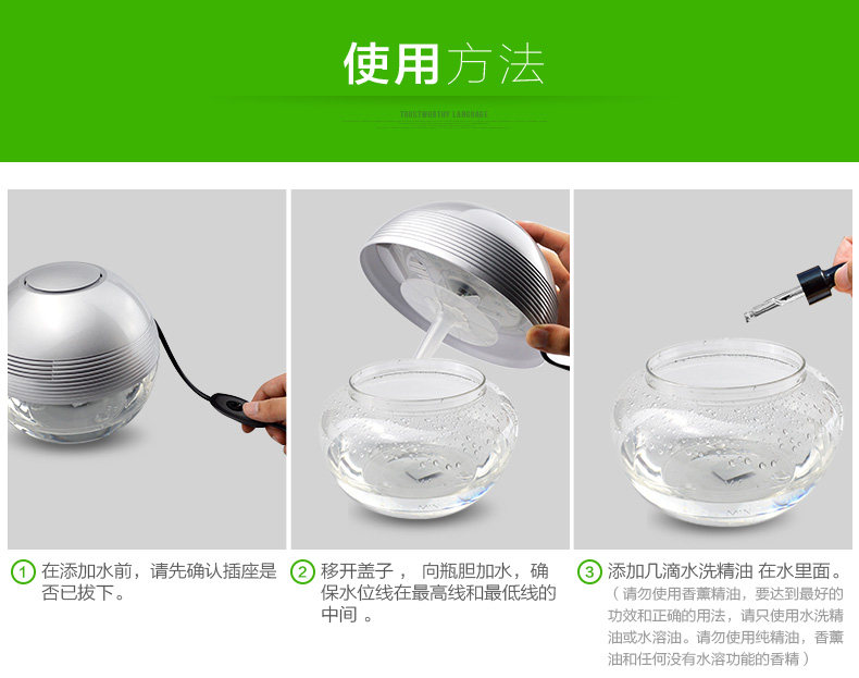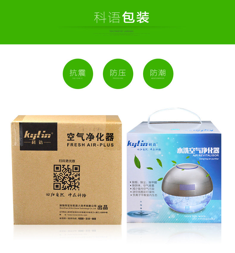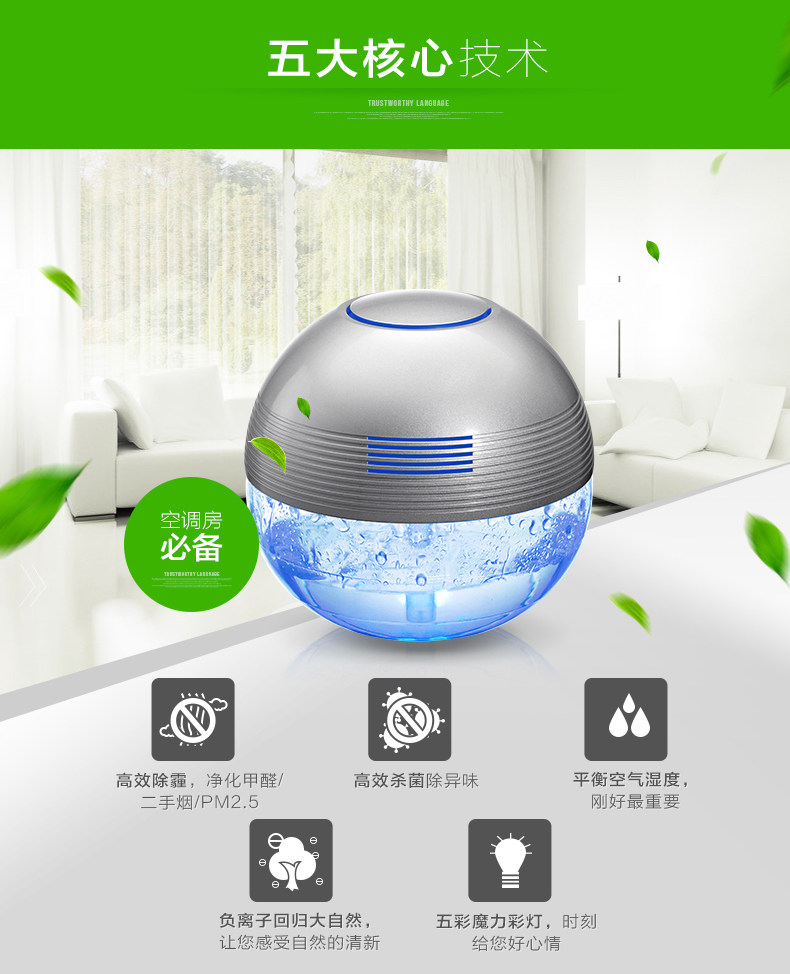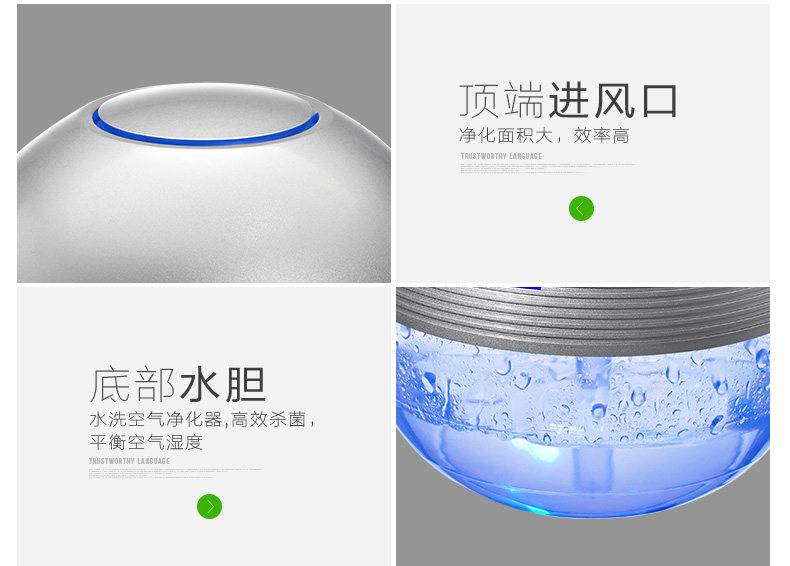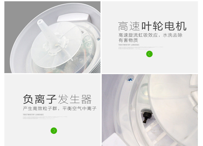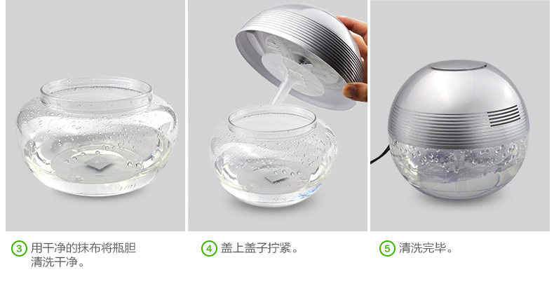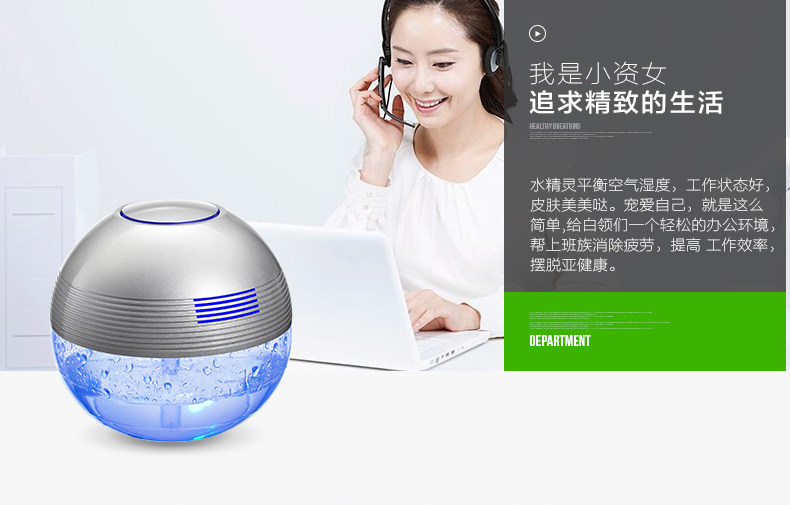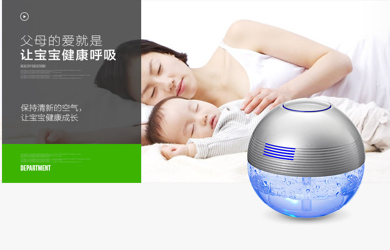The principle of turbo type structural design, the delicately designed wind wheel, can throw off the water evenly from all directions, so that the dust, bad smell and bacteria will be indrawn into water for decomposition or precipitation. Meanwhile, due to the rapid collision between water molecules and the wall of the bottle, artificial waterfall can be made so as to generate negative ions. Drip several drops of natural essential oil and perfume into the water to produce natural For aroma so as to make the purified air wet, fragrant, refreshing and clean.