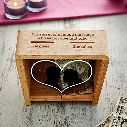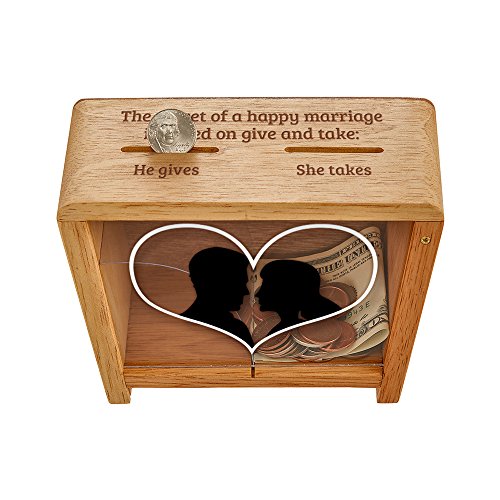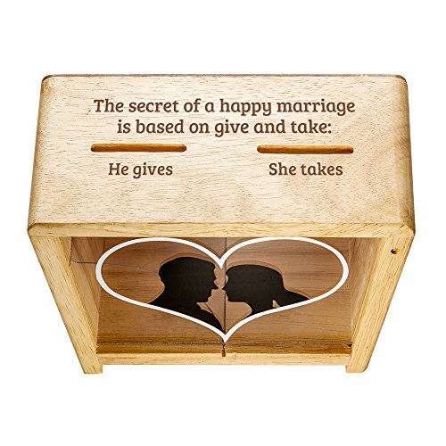 AMUSING ENGRAVING: The wooden box has a lovely heart print and is engraved on top with the message “The secret of a happy marriage is based on give and take”, while the two money openings state “He gives” and “She takes”. No questions asked.