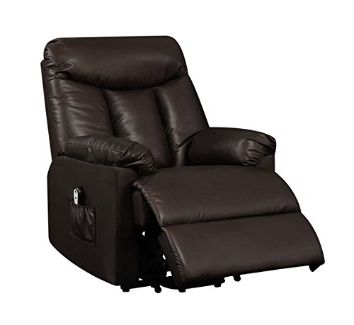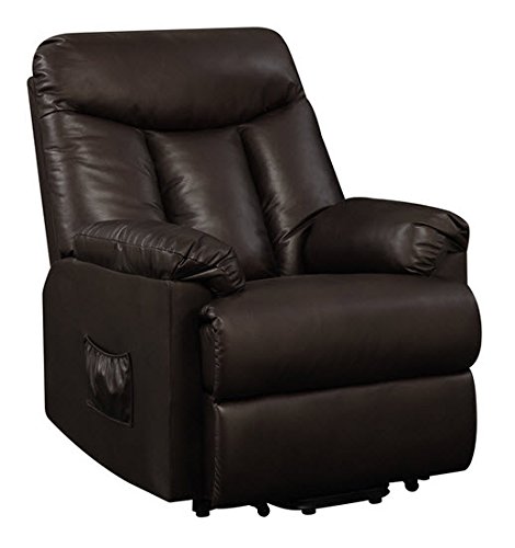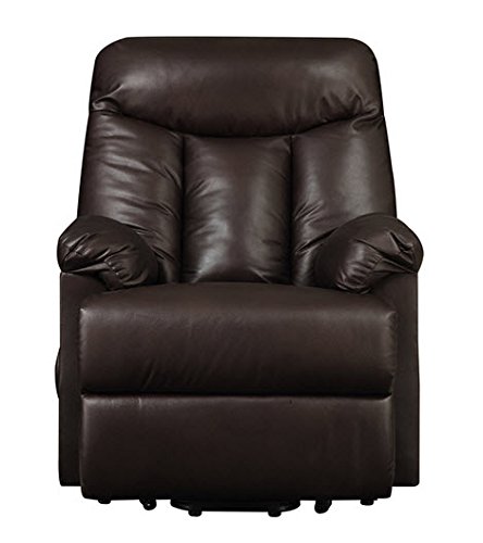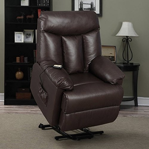 Studio : Best Home Publisher : Best Home Product Description The ProLounger Lya lift recliner chair is a comfortable addition to your home, making getting out of your seat a breeze. This wall hugger chair design only needs 4-inches of clearance from the wall to recline with the touch of a button and uses less floor space when reclining. This ProLounger lift and recline chair is easy to operate and features whisper quiet and smooth functionality to power lift and recline with the included wired power control. . . . . Frame materials: Laminated hardwood frame and heavy duty steel reclining mechanism. . . . . Upholstery color: Brown . . . . Upholstery materials: Renu leather . . . . Full chaise pad between the chair and the leg rest to support the legs for a truly comfortable recliner. . . . . Convenient side pocket on chair to store the wired remote. . . . . Renu leather is very durable, comfortable and breathable fabric that feels and looks like top grain leather. . . . . Renu leather is a composite of leather, polyester and polyurethane. . . . . Innovative engineering and packaging design enable to be easily assembled in the actual room. . . . . Ships in one (1) box. . . . . Takes less than 10 minutes to assemble. . . . . Dimensions: Seat: 19.5 inches high x 18 inches wide x 21.5 inches deep. . . . . Arm height: 25 inches high. . . . . Recliner is 68 inches fully reclined, 41 inches from the back of the seat to the footrest, 28 inches from the seat to the top of the recliner. . . . . Assembly required 0
