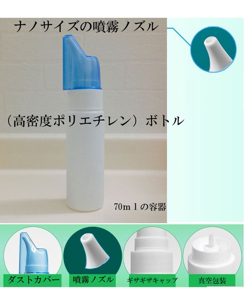 点鼻スプレーボトル空容器 70mlのボトル スプレータイプ 鼻洗浄 花粉対策 お鼻スッキリ ドライノーズ対策 指で上から羽部分を押すとスプレーされるタイプです。 キャップ付き。 1プッシュの噴霧量:0.1ml 【使用方法】 1.キャップをとります。 2.容器をもち、液が噴霧するまで、はね部を2~3回押してください。 衛生的に取扱い下さい。他の人と共用しないでください。 長期にわたって使用しない場合はきれいに洗浄して乾かし、日の当たらない乾燥で涼しい場所で保存してください 【素材】ボトル部:PE, スプレー部:PP.PE 4589943231383 |