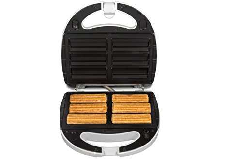 Empanada and Churro Maker Machine- Cooker includes 4 removable plates for 6 Churros or 2 Large Empanadas in Minutes: Make either 6 delicious churros or 2 large empanadas in minutes with this baker by Cucina Pro. Choose your own favorite toppings and fillings for a delicious snack or addition to your meal. Non-stick coated baking plates are removable for easy clean up. Dough cutting circle is included so you can measure the perfect amount of dough for your churros or empanadas every time. When you're done, the unit is easy to clean and compact for easy storage.Feature