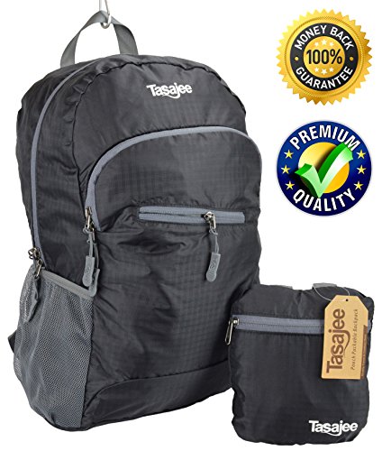 -. Feature : ✓ DURABLE & HIGH QUALITY: Tasajee (Australia) backpacks are made in China according to our strict quality specifications. The shell is made of 210D Nylon - super thin and light but very tough and durable. The zippers are quality YKK brand, and the backstraps, straps, webbing, and mesh are all made from durable nylon, not cheaper polyester. The top of the backstraps are each reinforced with 3 seams of bar-tack stitching (total 6 seams), offering heavy weight bearing capability. / ✓ THE PERFECT UNDER-SEAT FLIGHT CARRY-ON: An ideal small hiking or travel daypack, good for the gym or for biking. The perfect size for use as an under seat bag for essentials during your flight. Take it to work for use on your lunch break or deploy it to carry your groceries back from the shops. It folds up into a compact carry pouch that will take little room or weight in your main backpack, handbag or briefcase. / ✓ WATER RESISTANT: The shell is made of 210D waterproof nylon - gives you time to take shelter before your valuables are compromised (note: the zippers and seams are not waterproofed, so place belongings first in ziplock bags if kayaking or in constant rain or heavy downpours). / ✓ SPECIFICATIONS: ComP.R.Ises four separate compartments with zippers: three main outer compartments, and one secure interior zipper-pocket for your keys, wallet, purse, and valuables. 2 x bottle holders, one on each side. Weight 8oz (229 grams). Capacity 25 Liters. Dimensions: 17.5" (44cm) height x 11.5" (29cm) length x 9.5" (24cm) width when full. In pouch dimensions: 7" (18cm) high x 5.9" (15cm) length x 1.6" (4cm) thick. / ✓ MONEY BACK GUARANTEE: 45 Day Full-Money Back Satisfaction Guarantee. Our packable backpacks are made to last. If our daypack does not stand the test of reasonable use, or there are any signs of defective workmanship, simply return your daypack to Amazon within 45 days of purchase for a full refund. Return shipping is paid for by Amazon when you place your refund/return request within 30 days of purchase.