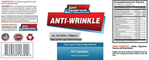 -. Feature : PREMIUM ANTI-AGING SUPPLEMENT: This premium blend of anti aging skin care vitamins helps increase skin hydration and elasticity, reduces fine lines and wrinkles. / ANTI-WRINKLE SUPPORT: Erase away the appearance of fine lines and discolorations for a lifetime of healthy, beautiful skin. / ANTI-WRINKLE BENEFITS: Loaded with powerful antioxidants to help prevent aging of skin. Delay the aging process by even a few years and enjoy enormous social benefits. / REJUVENATE YOUR SKIN: This product was formulated for all skin types. Enjoy your youthful and vibrant look again without worry. / OUR GUARANTEE: (6 Bottles - 360 Capsules) Our product uses best ingredients, proudly made in U.S. in FDA approved facility and followed by GMP guidelines.