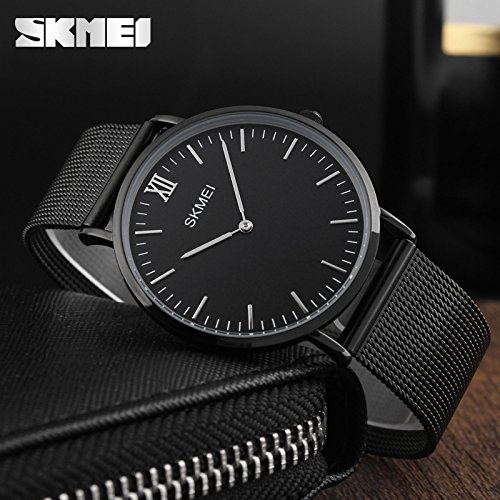 -. Feature : 1. This watch has a very slim profile, The band is nice and sturdy. / 2. This is a very nice looking mens watch. It feels good, wearing it very light, keeps very good time. / 3. Fashion Black watch with minimalist Black Dial, Ffeaturing Slender Stick Hour Markers, Baton-Shape Hands. / 4. Classic Design: Classic Style More embodies The Charm of Men, The Classic Style Was Carefully Designed, to Stand The Test of Time, While Maintaining its effortless Beauty. / 5. You in a Heavy Rain, Found That Clothes Have Been Soaked, Very SurP.R.Ised Things Happened! The Watch Does Not Have any Water. After Wearing a Year, You Will Find That The Watch Does Not Have any Discoloration and Rust.