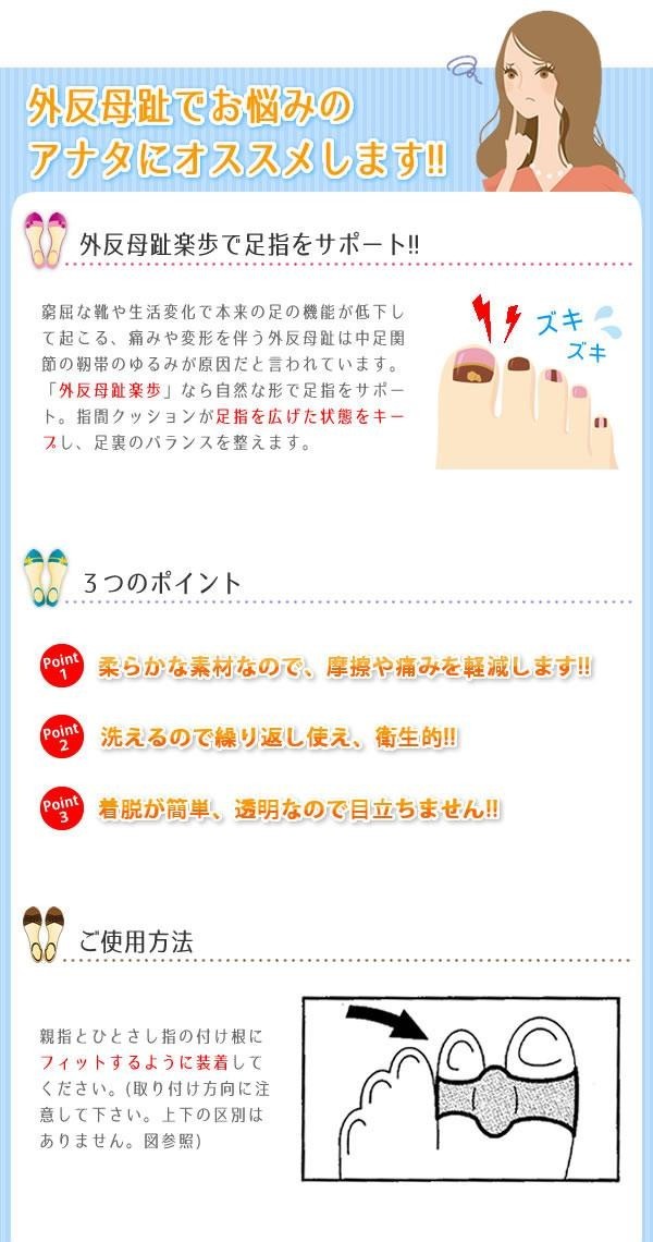 親指とひとさし指にフィットするように装着すれば、指間クッションが足指を広げた状態をキープ!!足裏のバランスを整え、足指をしっかりサポートします。エラストマーを使用。洗えるので繰り返し使え、衛生的です。 |