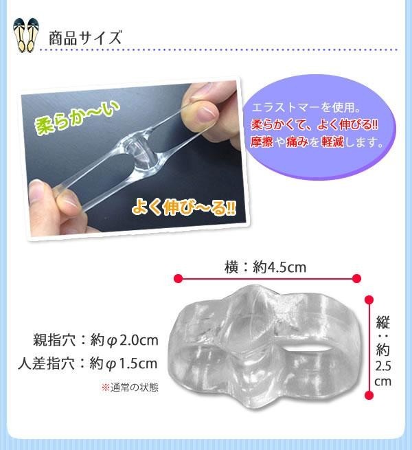 | 親指とひとさし指にフィットするように装着すれば、指間クッションが足指を広げた状態をキープ!!足裏のバランスを整え、足指をしっかりサポートします。エラストマーを使用。洗えるので繰り返し使え、衛生的です。 |