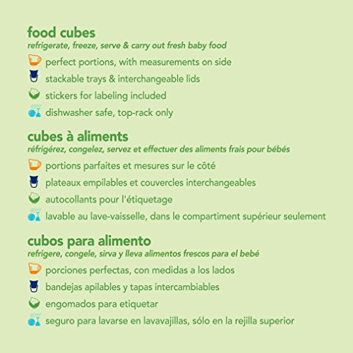 -. Feature : store, carry, & serve fresh, homemade baby food / made from durable, lightweight safer plastic the is convenient for travel / new, flexible lid design provides a leak-proof seal / marked with ounces and milliliters to measure portions / lids & trays interchangeable & stackable with all green sprouts food cubes