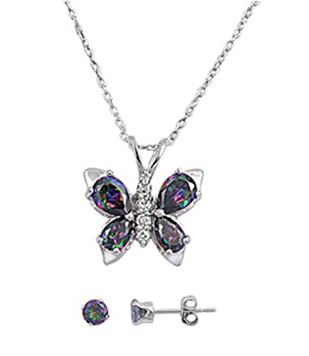 -. Title : Rainbow Colored Cz Butterfly .925 Sterling Silver Earrings & Pendant Necklace Set