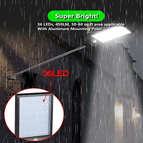 - SUPER BRIGHT 36 LED SOLAR LIGHTS -- 36 LED Design provides a super bright level of illumination(500 lumens) for a wide area, which is much brighter than other similar solar lights in the market.