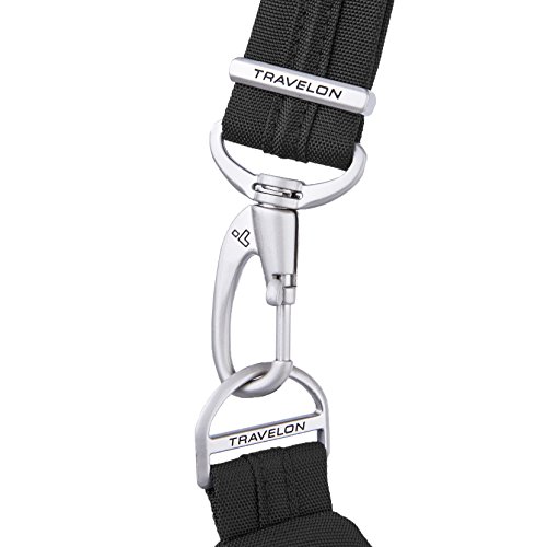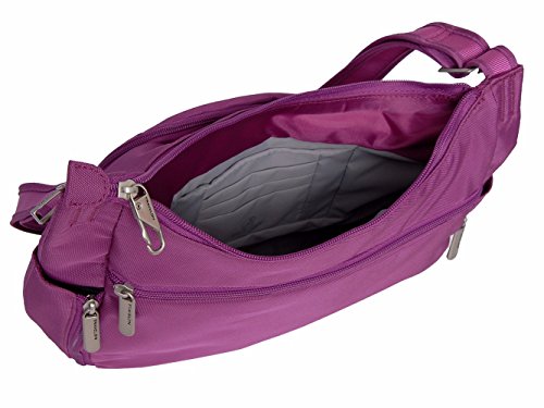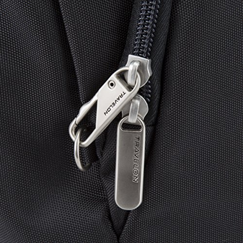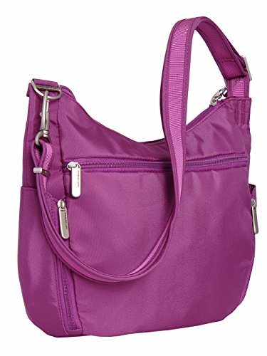 -. Binding : Apparel -. Brand : Travelon -. Department : womens -. Feature : Main compartment has RFID blocking card and passport slots / Front compartment has 2 wall pockets for organization / Front slash pocket and rear zip pocket / Two mesh expansion pockets hold water bottle or an umbrella / Adjustable cut-proof shoulder strap, attaches to post or chair -. Label : Travelon -. Manufacturer : Travelon -. PackageQuantity : 1 -. ProductGroup : Apparel -. ProductTypeName : LAGE -. Publisher : Travelon -. Studio : Travelon -. Title : Travelon Anti-Theft Cross-Body Bucket Bag