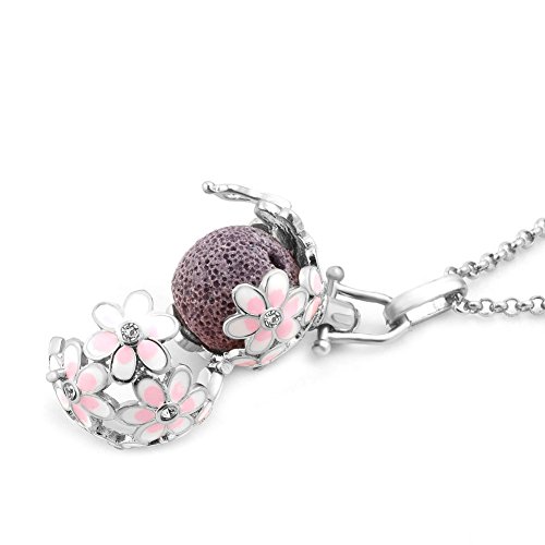 Third Time Charm Natural Lava Rock Stone Pink Flower Aromatherapy Essential Oil Diffuser Necklace Locket Pendant With 6 Lava Beads (Silver Plated)