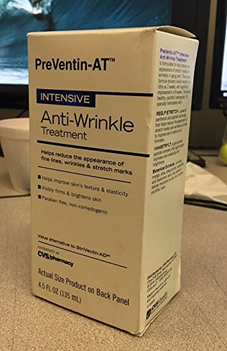 -. Binding : Misc. -. Brand : CVS -. EAN : 0671635850577 -. Feature : For Fine Lines & Deep Wrinkles NEW LOOK, NEW FORMULA Helps to reduce the appearance of fine lines, wrinkles & stretch marks. Helps improve skin's texture and elasticity Visibly firms and brightens Visibly reduces the appearance of fine lines, wrinkles and stretch marks Paraben free, non-comedogenic / CVS/pharmacy� PreVentin-AT" Advanced Wrinkle Therapy delivers visible results in as little as 2 weeks, with significant improvement in 8 weeks. Our new and improved formula is enriched with botanical extracts for added moisturization. The result is healthy, youthful looking skin. / VISIBLE RESULTS 2 WEEKS: Helps improve skin's texture and elasticity 4 WEEKS: Visibly firms and brightens 8 WEEKS: Visibly reduces the appearance of fine lines, wrinkles and stretch marks / DIRECTIONS: For Stretch marks: In a circular motion, gently massage into areas prone to stretch marks. Use morning and night. / For wrinkles: Apply to freshly cleansed face, concentrating on areas prone to wrinkles. Can be used alone or before applying moisturizer or foundation. Avoid getting cream in eyes. Apply two to three times daily. Results will continue to improve with use. -. IsAdultProduct : 0 -. Label : CVS -. Manufacturer : CVS -. MPN : 276778 -. PackageQuantity : 1 -. PartNumber : 276778 -. ProductGroup : Beauty -. ProductTypeName : BEAUTY -. Publisher : CVS -. Studio : CVS -. Title : CVS PreVentin-AT Advanced Wrinkle Therapy For Fine Lines, Wrinkles And Stretch Marks, 5 OZ Paraben free Non-comedogenic -. UPC : 671635850577