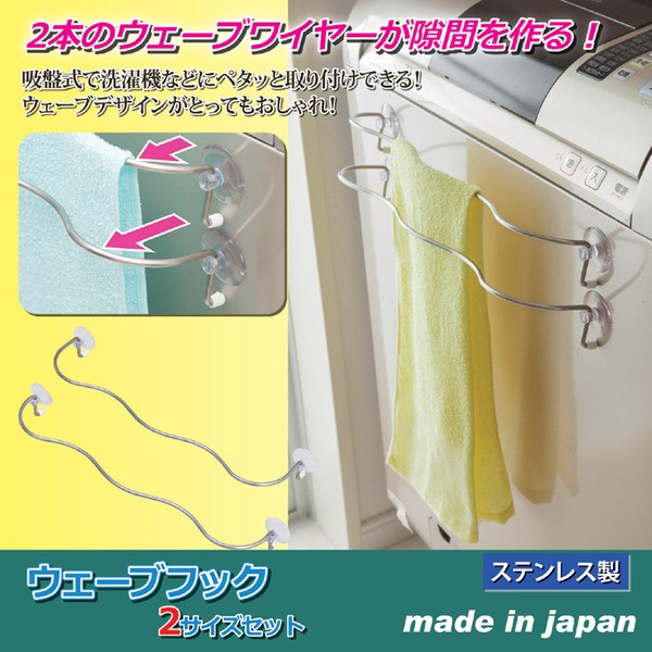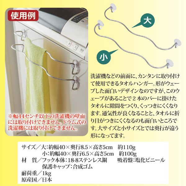 洗濯機などの前面に、カンタンに取り付けて使用できるタオルハンガー。形がウェーブした面白いデザインなのですが、このウェーブがあることで2本のバーに掛けたタオルに隙間をつくり、くっつきにくくなります。通気性が良くなることと、タオルに折り目がつきにくくなるのも面白いところです。大サイズと小サイズとでは奥行が違う形になってます。