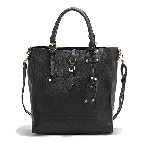 Made from high quality synthetic leather with gold-tone hardware. Front pocket. Dual carrying handles and detachable shoulder strap. Buckle closure. Removable fully lined inside compartment. Interior zip wall and slip pockets. Metal feet on the bottom. BEFORE PURCHASING, PLEASE COMPARE THE SIZE OF THIS HANDBAG TO ONE OF YOUR OWN FAVORITE BAGS.Feature