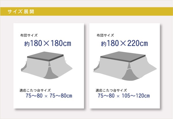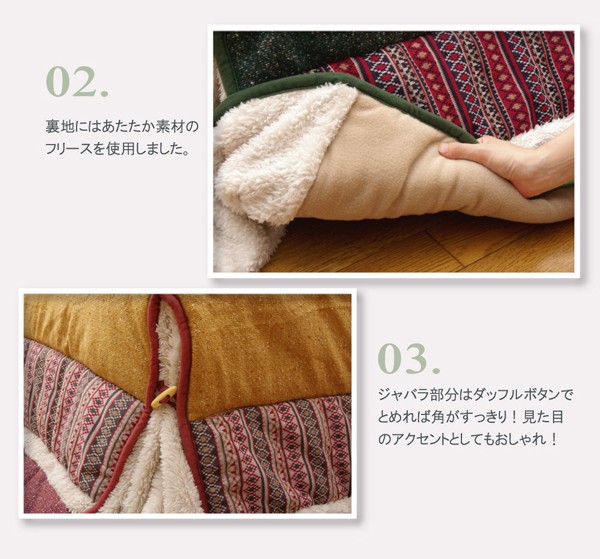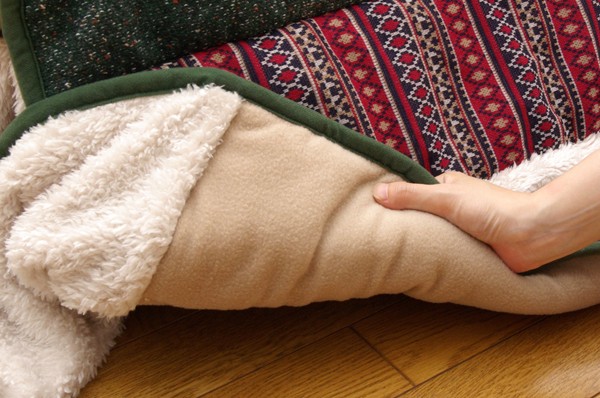 あたたかみのあるカラーと素材を使用したカジュアルテイストなこたつ布団です。表地には伸縮性のあるニット素材をパッチワークすることでより、冬らしさを演出しました。省スペースタイプで角が膨らまず、お部屋を広く使えます。薄手なので折りたたんでもかさばらず、コンパクトに収納できます。部分暖房のコタツは電気代もおトクです。