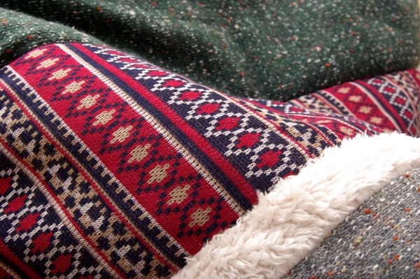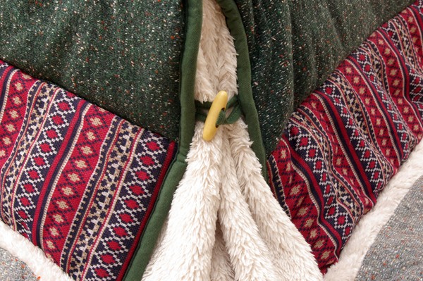 表地=(ニット無地部)ポリエステル55% アクリル25% 綿20%(天板部)ポリエステル100%(柄部)ポリエステル100%(毛羽部)ポリエステル100% 裏地=(タレ部)ポリエステル100%(天板部)ポリエステル80% 綿20% 中材=ポリエステル100% 0.55kg
