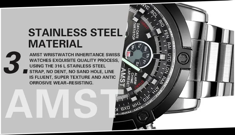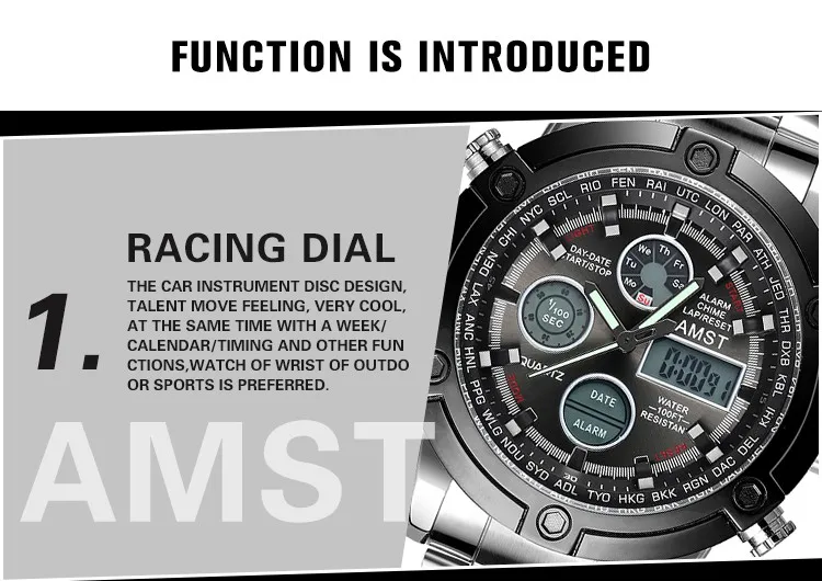 Feature:Alarm,Back Light,Water Resistant,Stop Watch,Multiple Time Zone,Auto Date,LED display