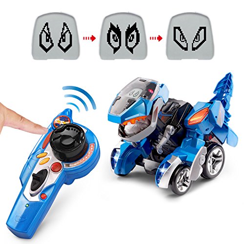 -. Feature : Angus the RC T-Rex is a 2-in-1 remote control toy that easily switches from a dinosaur to a vehicle and back again with the push of a button / Remote control includes steering wheel, transformation button, action button, talk button, sound button, style button, light button and volume button / Press the buttons on the remote control to hear amazing dinosaur facts, wild sounds and fun phrases / LCD screen displays customizable dinosaur eyes and dashboard. Product Dimensions: 15.1 x 9.6 x 8.7 inches / Recognition point lets the dino and rider talk to one another, communicating about the mission to gather more lava stones