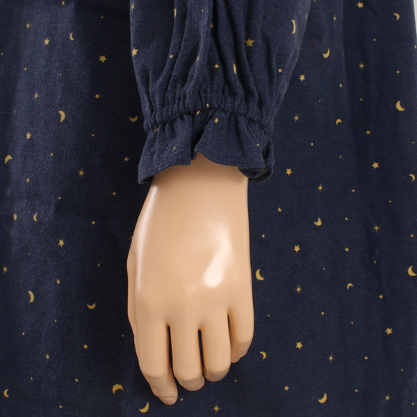 네이비 칼라에 밤하늘의 쏟아지는 별처럼 작은 별 달이 엘로우 칼라로 프린트된 동절기 제품입니다.