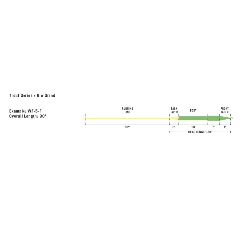Studio : RIO Products Publisher : RIO Products Binding : Misc. Product Description The RIO Grand is one full size heavier than AFTMA standard and features weight distributed toward the front of the line to easily load fast action fly rods. RIO's new MaxCast and MaxFloat Tip technologies make the line float higher, cast longer and last longer. Welded loops on both the MaxFloat Tip (TM )for quick changes of leaders and on the back end. DualTone colors show the ideal casting point. Weights and lengths: WF4F-WF5F, Length: 90 ft (27.4 m); WF6F-WF7F, Length 100 ft (30.5 m). Colors: pale green/lt. yellow camo/tan. 0