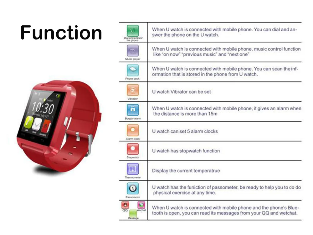 Function:Dial Call,Answer Call,Chronograph,Passometer,Big Three Needles,Push Message,Message Reminder,Interactive Music,Call Reminder,Calculators,Calendar,Sleep Tracker