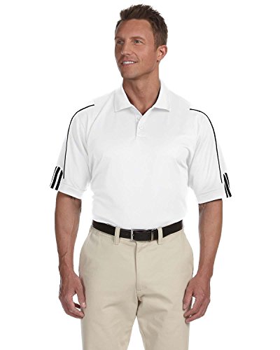Product Description 100% polyester; essential moisture management piqu wicks away moisture; keeps you dry and comfortable; set-in, open-hem sleeves; side vents, rib-knit collar and three-button placket; contrast 3-Stripes piping detail on sleeves; contrast heat-sealed adidas performance logo on back neck; 0