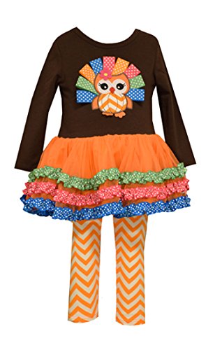 -. Feature : Thanksgiving owl on solid knit bodice with ruched mesh skirt to chevron P.R.Int knit pant. / DRESS: 95% COTTON 5% SPANDEX, PANT: 95% COTTON 5% SPANDEX / Hand Wash Cold, Line Dry