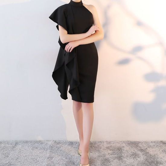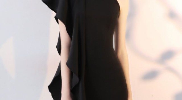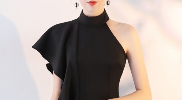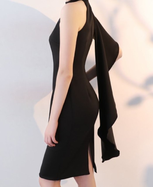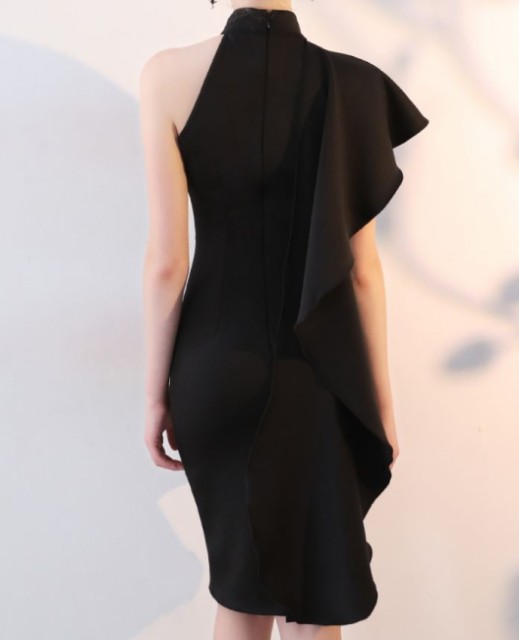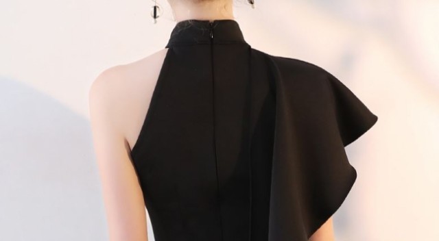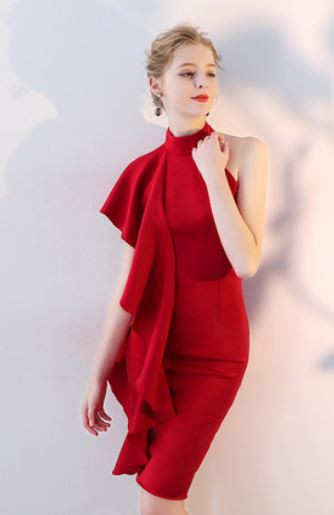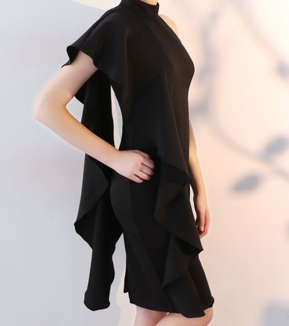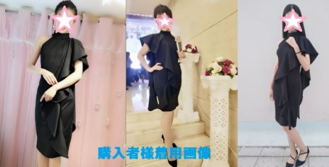 肩から釣り下がるようなフリルが特徴的かつ、魅力的なワンピースドレスです。