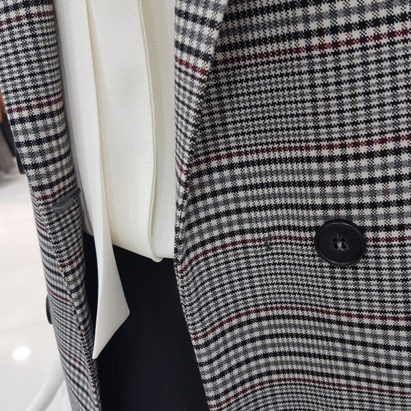 더블버튼디테일에 기본핏재킷이네요 배색롤업소매가 세련한 아이구용와인믹스체크에 선명하고 올드하지 않아요깔끔 세련 멋스럽게~^^고루 갖춘 아이네요총장88