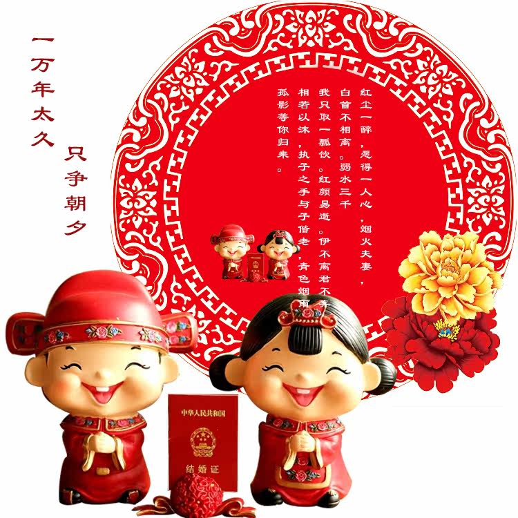 栩栩如生的表情中洋溢着甜蜜而幸福的微笑。流畅的线条勾勒出完美的造型和喜庆的神情,简直就是天造的地设。此款婚庆娃娃采用的是环保无毒树脂材料,人工彩绘加工而成。适合在家居摆饰,婚庆送礼,寓意着新婚夫妇甜甜蜜蜜,幸幸福福,和和美美。