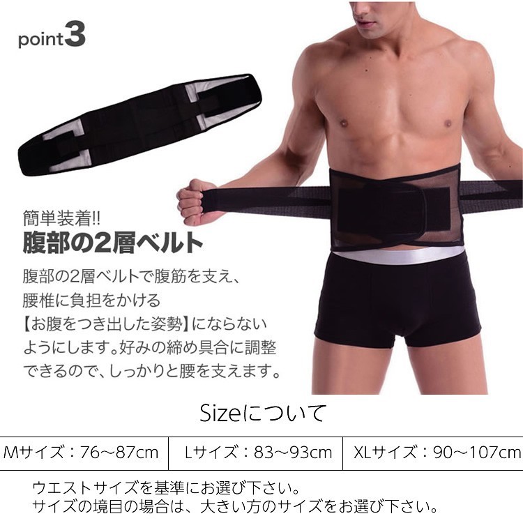 コルセット 腰痛ベルト 腰用サポーターあなたのお悩み解決します。腰が痛くて靴下が履けない!長時間同じ姿勢がつらい!腰の調子が悪い!そんな時は当店のコルセットで解決!腰の動きをしっかりホールド!姿勢も正しくなります。蒸れないし軽い腰痛ベルト!ヘルニアになる前に予防!腰痛になる仕事の方必見!現場仕事や医療、介護、デスクワーク、工事現場の人におすすめ!ストレッチやマッサージも大事ですがコルセットも欠かせません。サイズについてMサイズ:76~87cmLサイズ:83~93cmXLサイズ:90~107cm